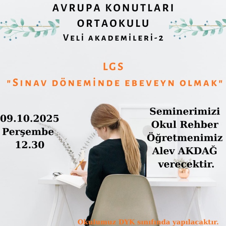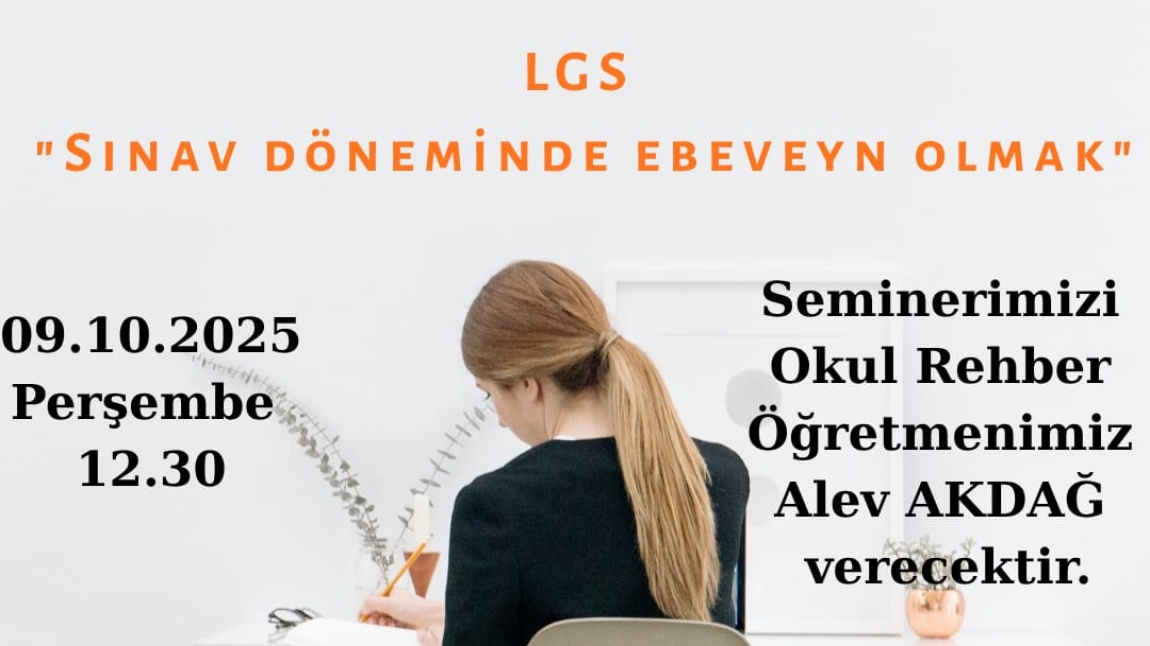 LGS Sınav Döneminde Ebeveyn Olmak seminerini okul rehber öğretmenimiz Alev AKDAĞ verecektir.Tüm 8. sınıf velilerimiz, 9.10.2025 Perşembe günü saat 12.30'da DYK sınıfında verilecek olacak seminere davetlidir.