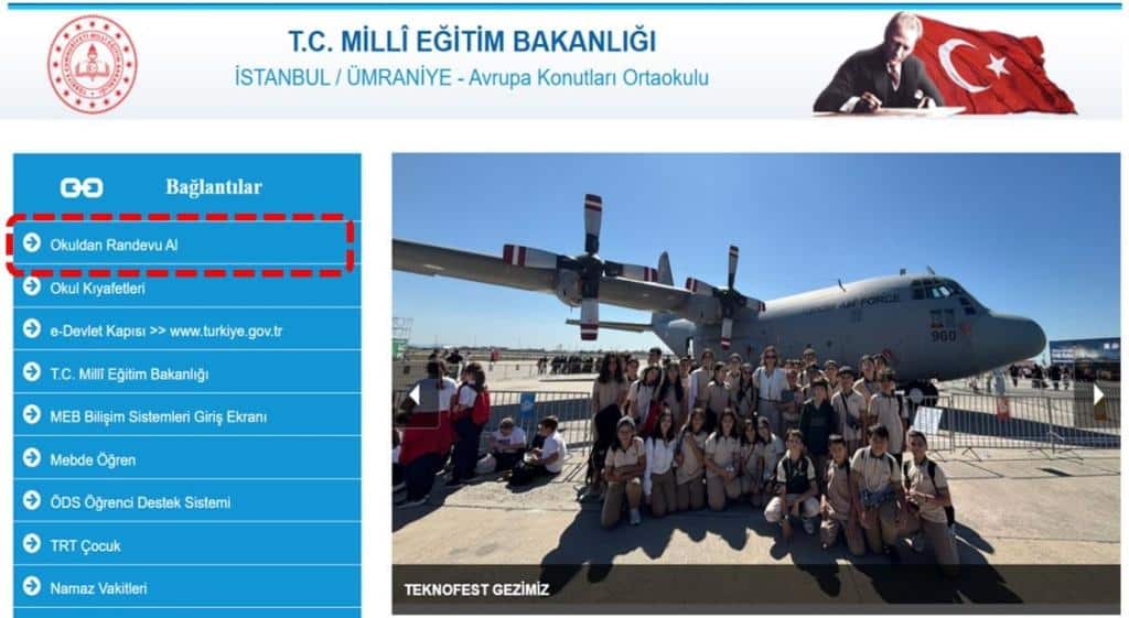 Velilerimizin öğretmenlerle görüşmesi için okul web sitemizde sol tarafta yer alan "Okuldan Randevu Al" düğmesine tıklayarak, randevunuzu oluşturabilirsiniz.